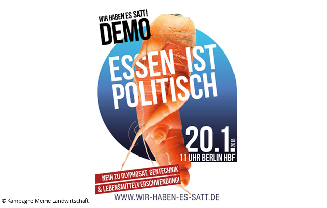 Am 20. Januar 2018 werden in Berlin wieder tausende Menschen für eine bäuerliche und ökologischere Landwirtschaft demonstrieren. Das Bündnis „Wir haben es satt!“, dem auch die NaturFreunde Deutschlands angehören, fordert unter dem Motto "Der Agrarindustrie die Stirn bieten!" eine bäuerliche, ökologischere Landwirtschaft und Zugang zu gesundem Essen für alle.