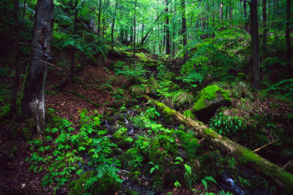 Kühlende Buchenwälder mit kleinen Bachläufen bieten Feuersalamandern den perfekten Lebensraum und die dort verrottenden Baumstämme gefallener Waldriesen lassen eine Szenerie entstehen, die wie „echter Urwald“ anmutet.